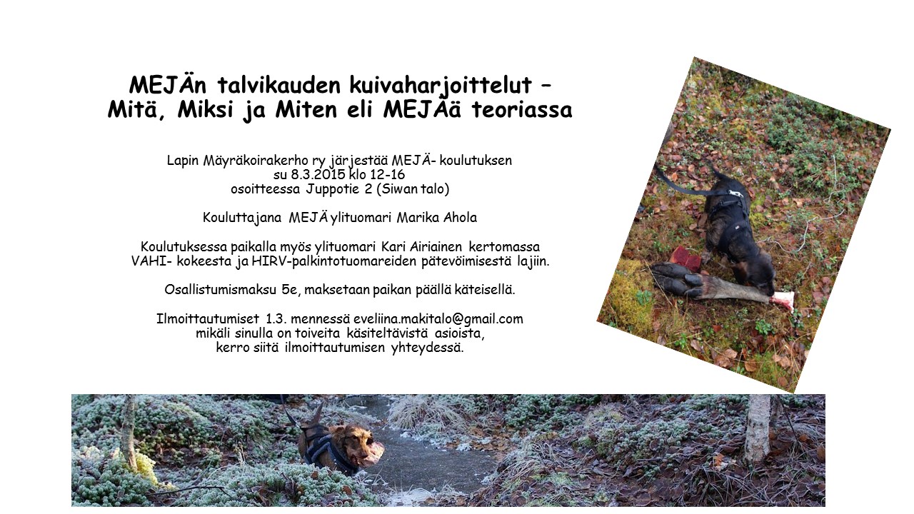 MEJÄ:n talvikauden kuivaharjoittelut, ”Mitä, miksi ja miten eli MEJÄä teoriassa”. Su 8.3. klo 12-16 Rovaniemellä osoitteessa Juppotie 2 (Siwan talo). Kouluttajana MEJÄ-ylituomari Marika Ahola, paikalla myös ylituomari Kari Airiainen kertomassa VAHI-kokeesta ja HIRV-palkintotuomareiden pätevöitämisestä lajiin. Osallistumismaksu 5€ maksetaan paikan päällä käteisellä. Ilmoittautumiset ja toiveet koulutuksessa käsiteltävistä asioista 1.3. mennessä eveliina.makitalo@gmail.com