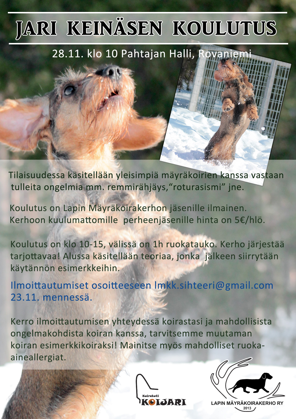 Kurssimaksu 20 €, sisältää oppimateriaalin, Lapin Mäyräkoirakerhon tilille FI98 5640 0220 2669 07.