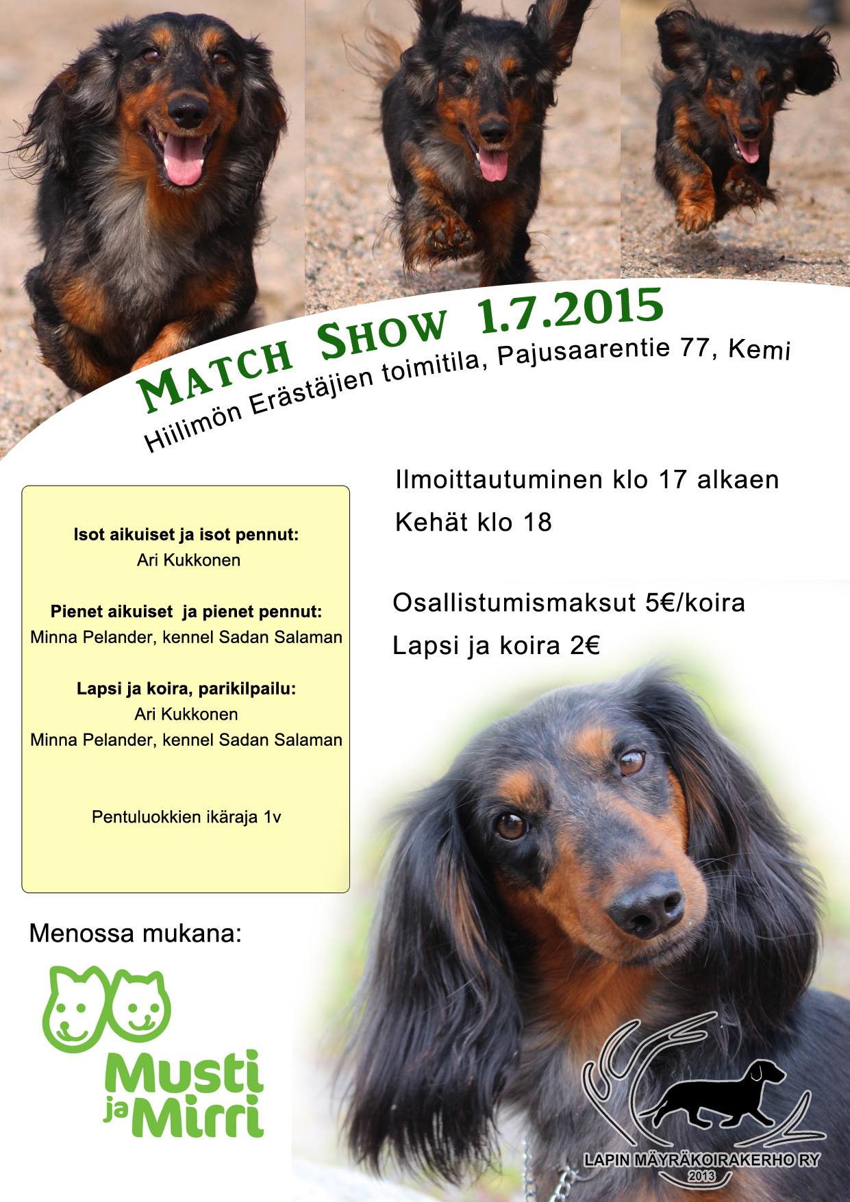 Lapin Mäyräkoirakerho ry järjestää match shown sunnuntaina 16.8. Rovaniemellä Lappi Areenan parkkipaikalla.